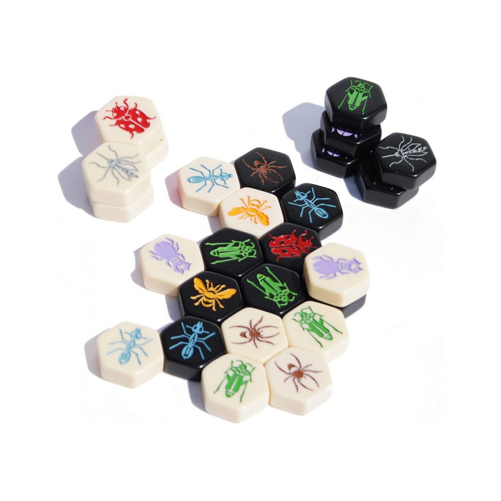 Es como un ajedrez evolucionado donde las piezas son insectos y el tablero se construye sobre la marcha. Sin tablero físico, sin cartas, sin dados, solo piezas de baquelita que no se rompen, no se mojan y no ocupan nada. Me lo llevo de viaje, a la piscina, a un restaurante… donde haya una superficie plana y dos personas con ganas de pensar, Hive funciona.